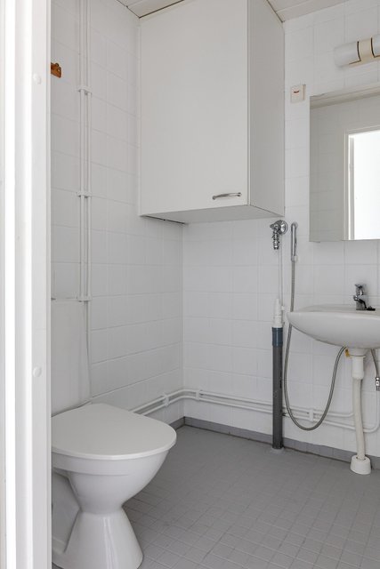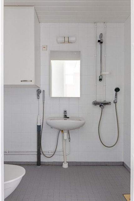- WC-istuin, suihku, pesuallas, peilikaappi, pesukoneliitäntä, ja bidee-suihku