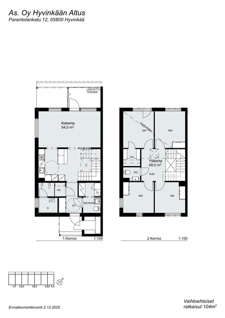 - Pinta-ala on yhtiöjärjestyksen mukaan 105 m², pohjapiirustuksen mukaan 104 m². Pinta-ala tarkentuu myöhemmin.