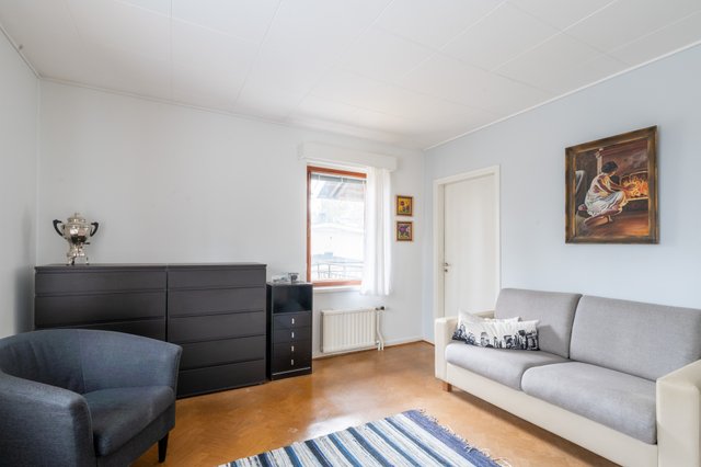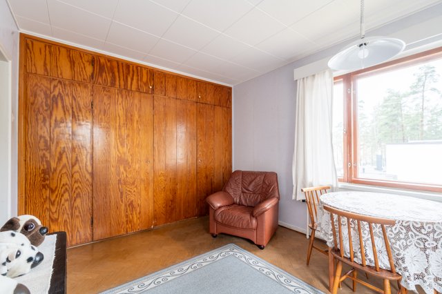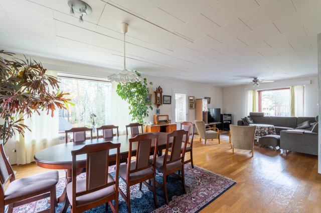 - Olohuoneita on tässä talossa kaksi, joista yksi sijaitsee 1.-kerroksessa ja palvelee tällä hetkellä keittiön jatkeena isona ruokailutilana. 2. kerroksessa on suuri olohuone, johon mahtuu niin sohvaryhmä kuin juhlaruokailutila. Olohuoneesta on käynti parvekkeelle, josta on idyllinen näkymä omalle takapihalle ja kirkkopuistolle. Tästä olohuoneesta voisi tarvittaessa myös helposti jakaa vielä työhuoneen tai makuuhuoneen, jos on tarvetta.