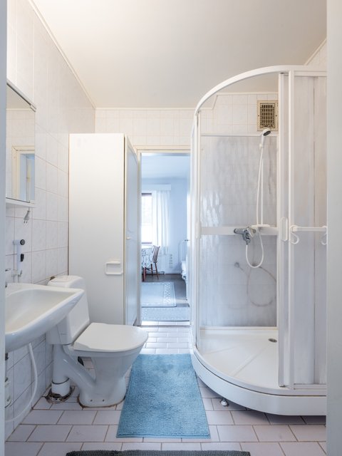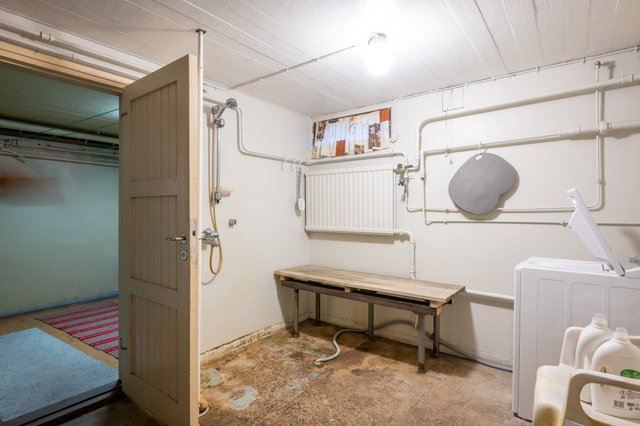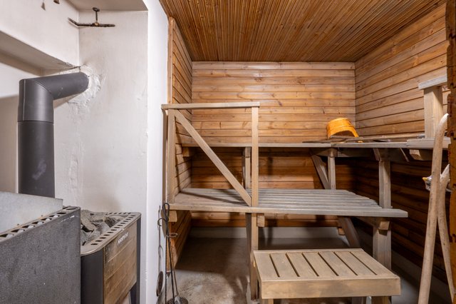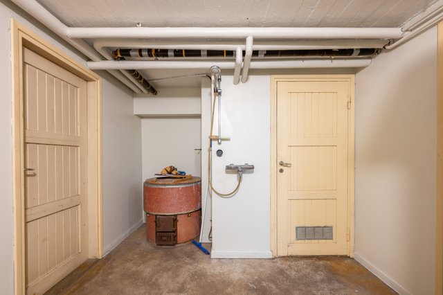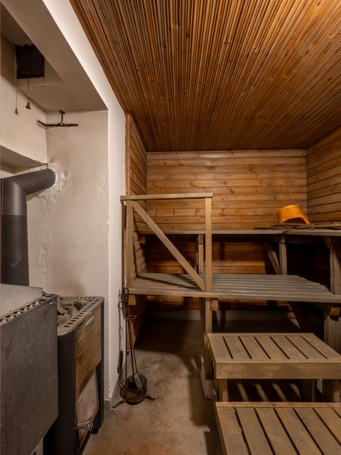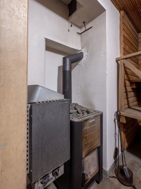 - 2. kerroksessa on kylpyhuone (90-luvulla viimeksi uusittu), jossa suihkukaappi, wc ja lavuaari (lattia ja seinä laattaa). Kellarikerroksessa saunan yhteydessä on kylpyhuone, jossa on 2 suihkua ja vanha pata pesuveden lämmitykseen, jonka toimivuudesta ei ole tietoa, koska se ei ole ollut pitkään aikaan käytössä (lattia ja seinät betonia). Lisäksi kellarin kylpyhuoneessa on pesukoneliitäntä ja tilaa pesutornille.