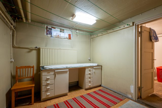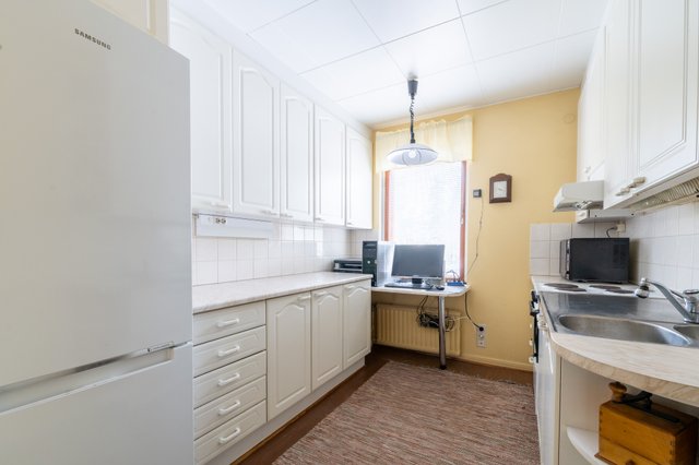 - Viereisessä kylpyhuoneessa on pesukoneliitäntä ja tilaa pesutornille. Kodinhoitohuoneessa on tilaa pyykkien kuivaamiselle ja taso alakaappeineen.