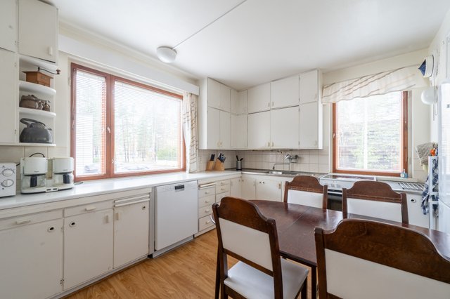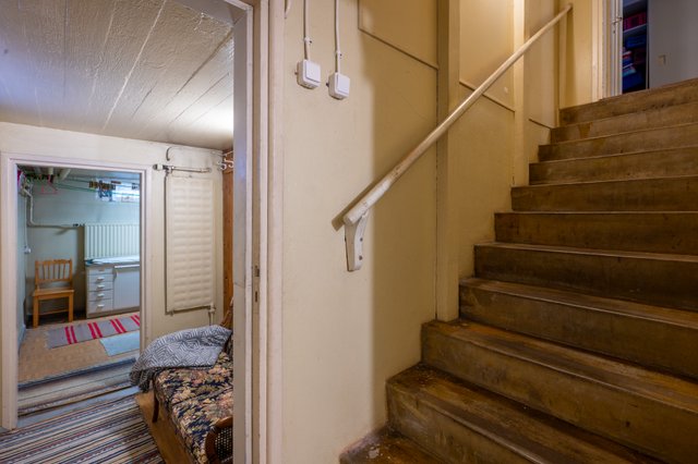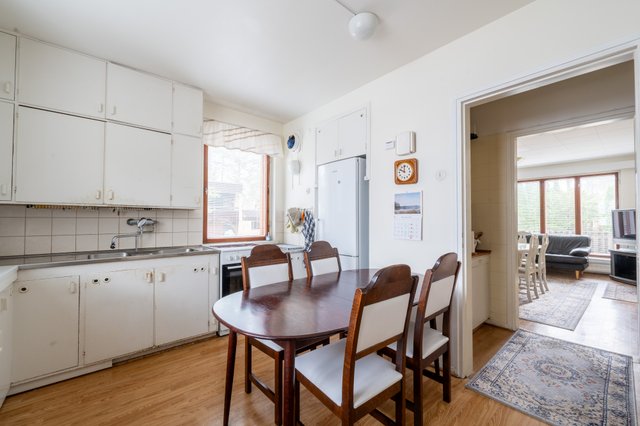 Kuten vanhojen talojen luonteeseen kuuluu, tämäkin koti vaatii hiukan rakkautta ja kunnioitusta. Märkätilat ja osittain talotekniikka ovat teknisen käyttöiän päässä, ja kivikellarin kosteustilanteeseen on syytä paneutua varsinkin, jos sen haluaa ottaa asuintilaksi käyttöön, mutta talon kaunis alkuperäinen ilme, rappauksen vaalea eleganssi ja 1950-luvun arkkitehtuuri antavat vankan, arvokkaan pohjan kunnostuksille. Tämä ei ole pelkkä projekti, vaan perintö – aihio, josta rakkaudella ja taitavalla otteella syntyy jälleen komea kotikartano.