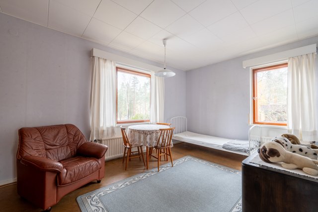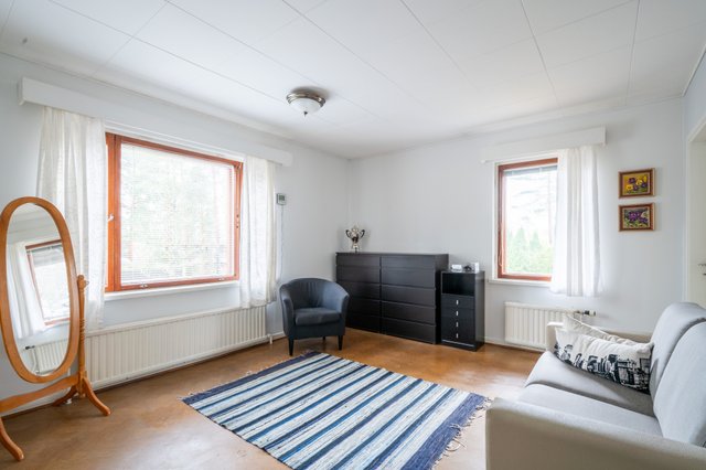 - 1. kerroksessa on 4-5 makuuhuoneeksi soveltuvaa tilaa, joista yksi on suuri entinen lääkärin vastaanottohuone, jonka perällä toinen entisenä hoitohuoneena toiminut makuuhuone ja kolmas aika pieni makuu-/työhuone sekä aula, joka on nykyisillään myösmakuuhuonekäytössä. 2. kerroksessa varsinaisia makuuhuoneita on 2 kpl, joiden lisäksi tarvittaessa olohuoneesta saisi helposti eroteltua vielä lisähuoneen. Kellarin askartelutilassakin on yövytty.