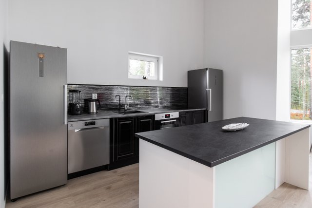 - Jääkaappi, erillinen pakastin, uuni, liesituuletin, astianpesukone, ja keittiösaareke