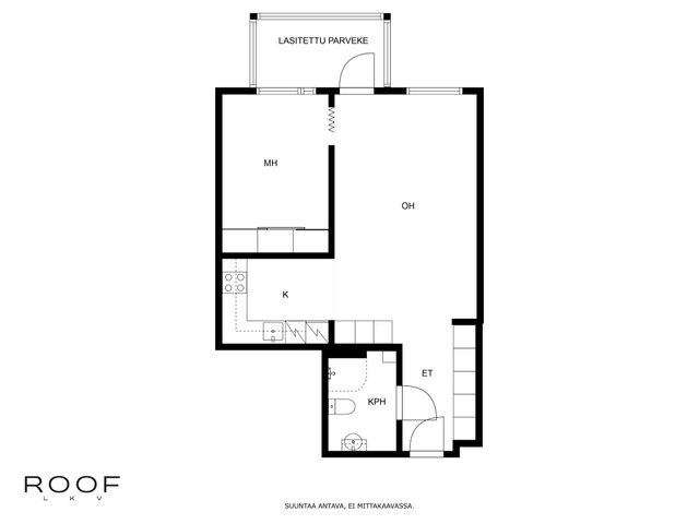 Tähän kotiin on helppo ihastua. Tilava ja toimiva pohjaratkaisu. Olohuone ja keittiö muodostavat yhtenäisen tilan, jossa on mukava viettää yhteistä aikaa. Olohuoneesta käynti myös lasitetulle parvekkeelle. Keittiössä on valkoiset kaapistot sekä hyvin säilytys-ja laskutilaa. Makuuhuoneeseen mahtuu parisänky. Säilytys tilaa löytyy runsaasti. Kylpyhuoneeseen esteetön kulku.