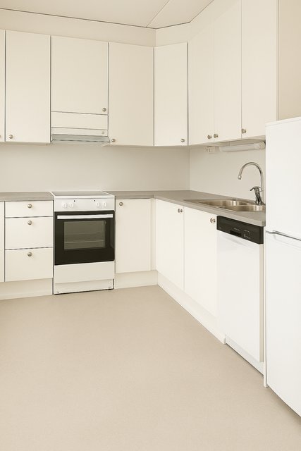 - Jääkaappipakastin, uuni (kiertoilmauuni), liesi, liesituuletin (aktiivihiilisuodatin), ja astianpesukone