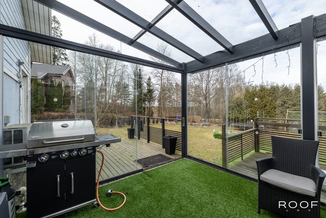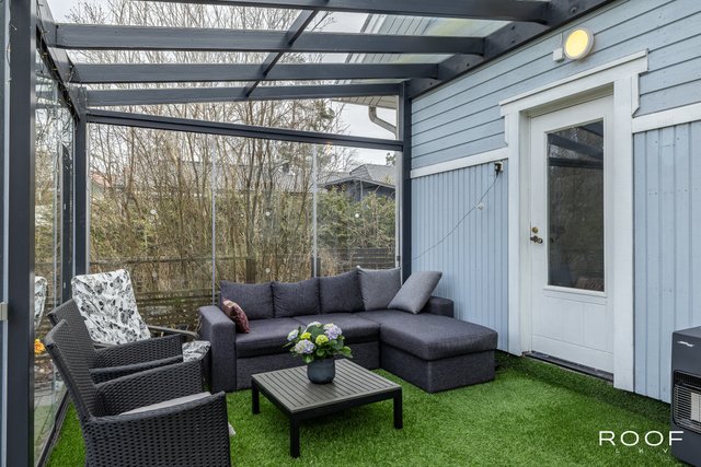 Kaksi talon sivua kattava terassi tuo lukuisia käyttömahdollisuuksia. Lasitettu osa toimii suojaisana oleskelutilana ja mahdollistaa viihtyisän