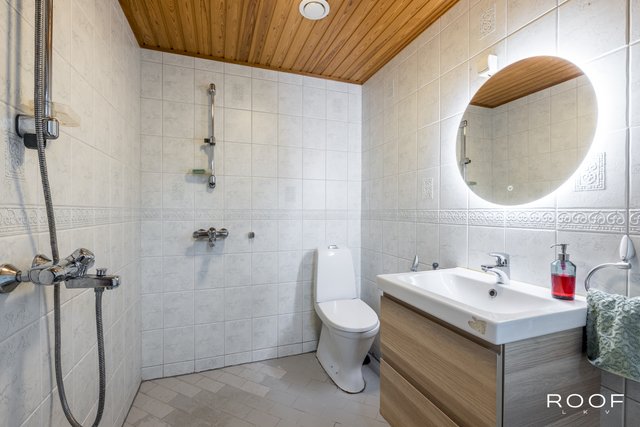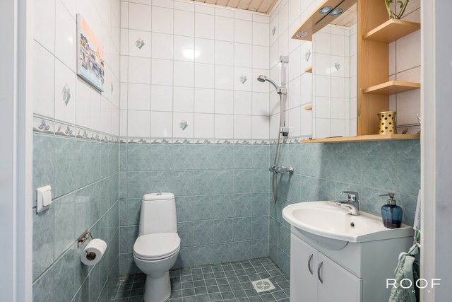 - LATTIA: laatta SEINÄT: laatta VARUSTEET: suihku, wc-istuin, allaskaappi, peili valolla.