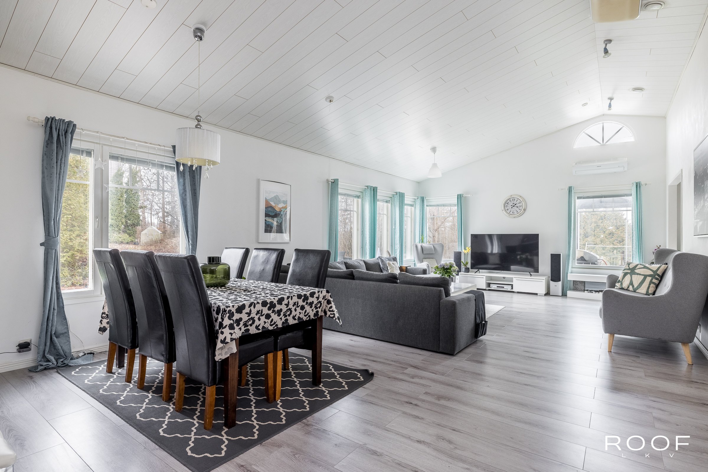 ruokailutila ja olohuone, jossa suuret ikkunat ja korkea huonekorkeus luovat avaran ja valoisan tunnelman.