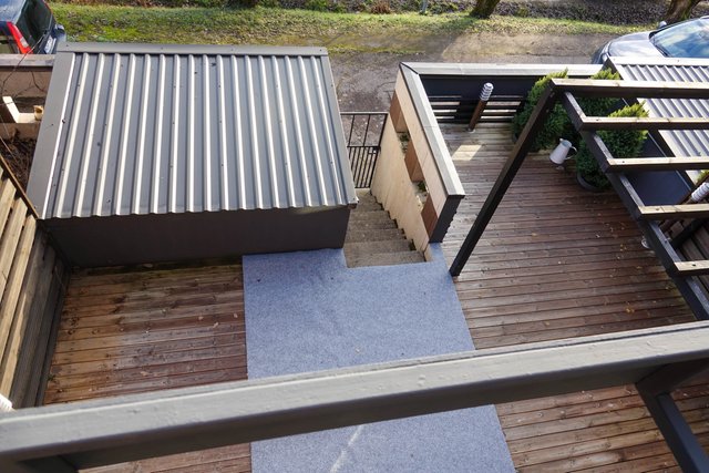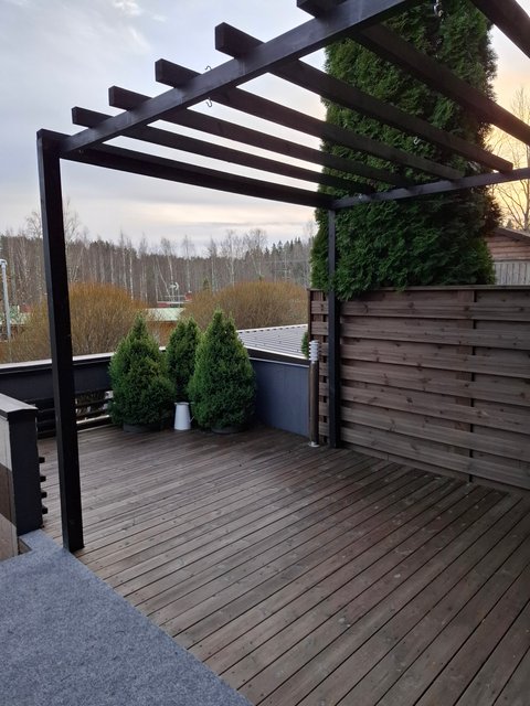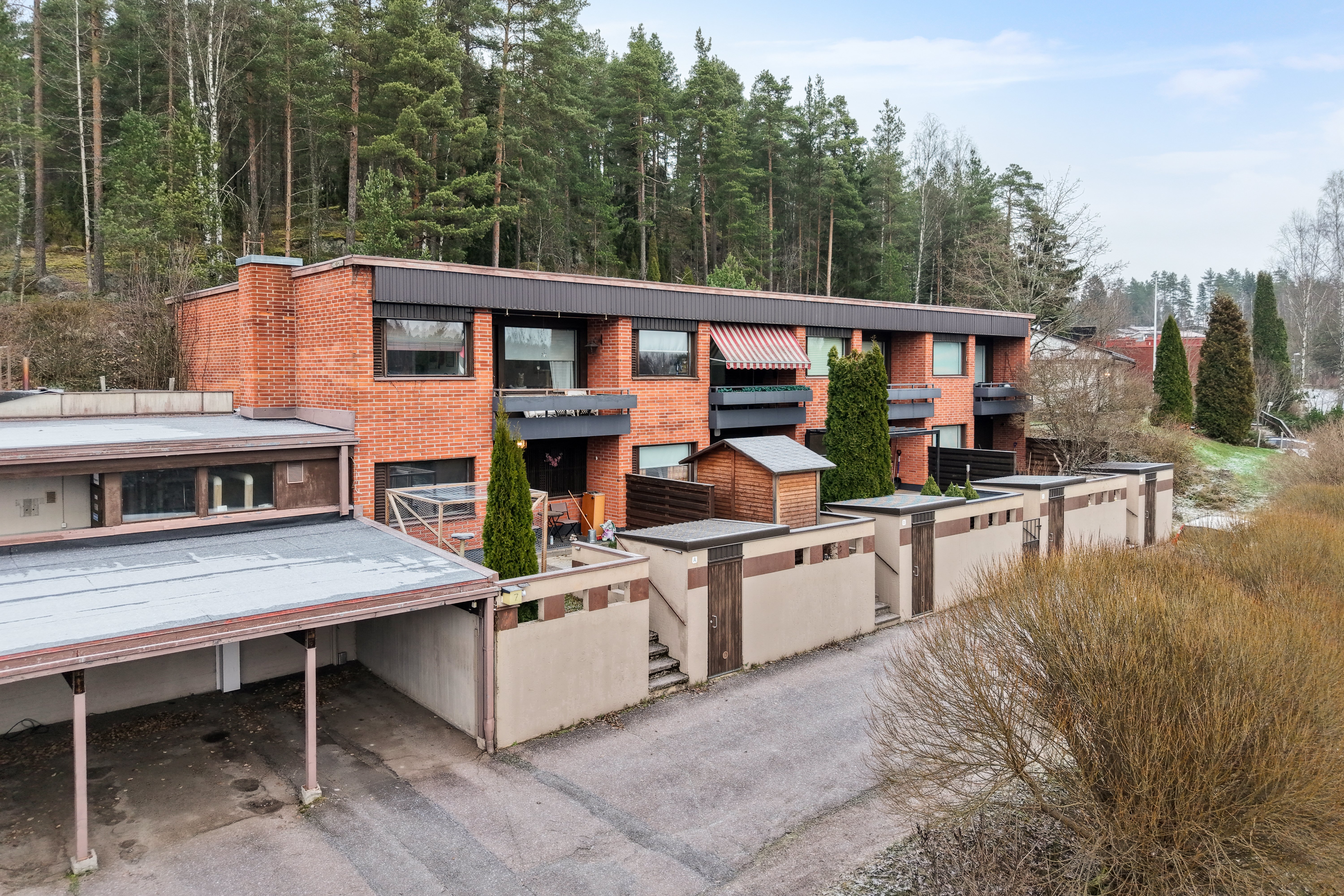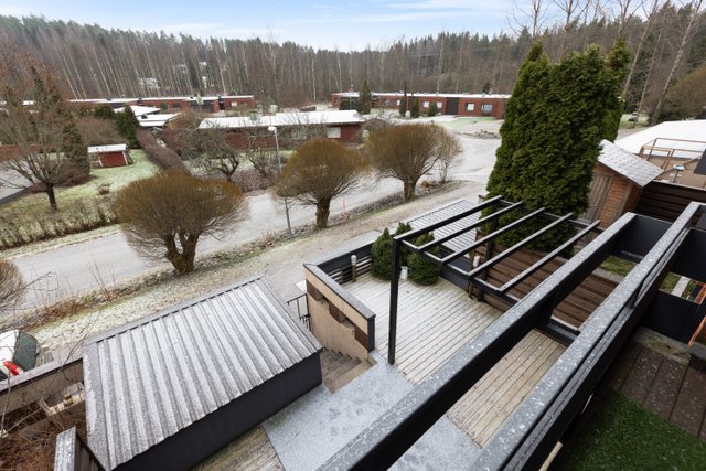 Asunnon etuterassi on muutettu viihtyisäksi ja mukavaksi ulko-oleskelualueeksi, jossa voi nauttia rauhallisista hetkistä tai järjestää pieniä kokoontumisia. Yläkerran parveke tarjoaa lisää tilaa ulkoelämää varten. Asunnon edessä on oma ulkovarasto sekä autokatos talon päädyssä, mikä takaa käytännöllisyyden ja järjestyksen.