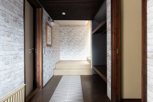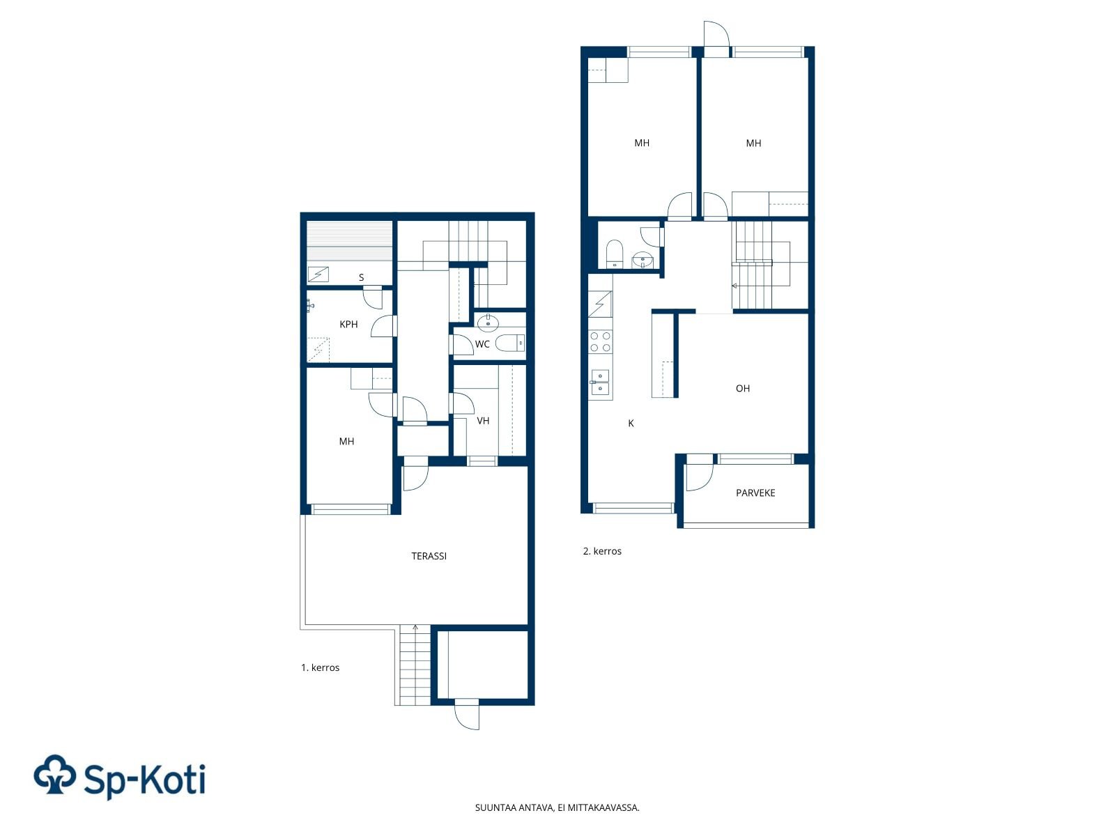 Alakerrasta löytyy makuuhuone, tilava luonnonvaloa saava vaatehuone, wc sekä saunaosasto. Yläkerrassa sijaitsevat hyvin varusteltu keittiö, valoisa olohuone avarilla näkymillä, parveke, kaksi makuuhuonetta sekä toinen wc. Toisesta yläkerran makuuhuoneesta on suora pääsy metsäpolulle.