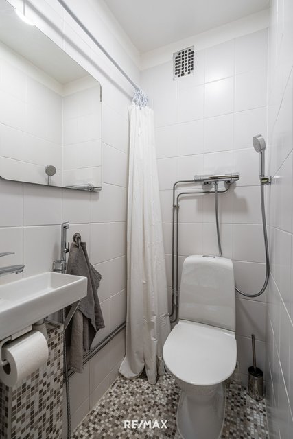 - WC-istuin, suihku, lattialämmitys, pesuallas, allaskaappi, ja peili