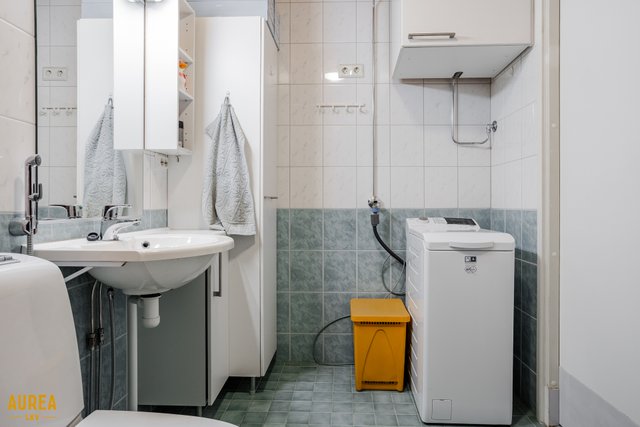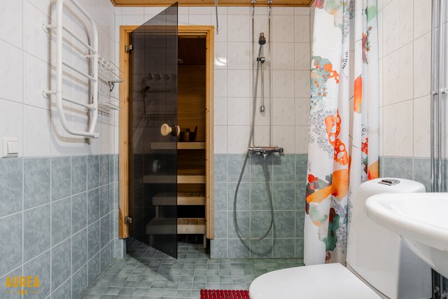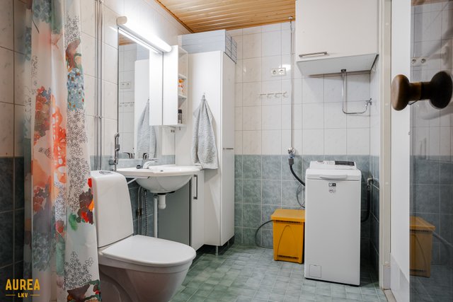 - Suihku, wc-istuin, pesukoneliitäntä, peili, bidee-suihku, ja pesuallas