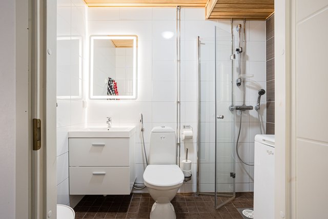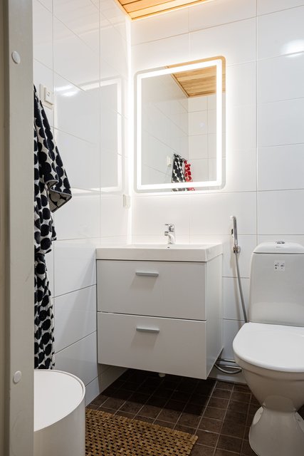 - WC-istuin, suihku, pesukoneliitäntä, lattialämmitys, allaskaappi, ja bidee-suihku