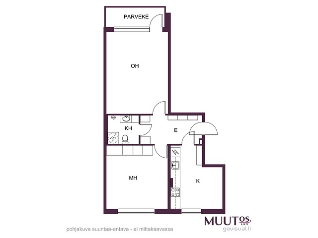 - Pinta-ala ei ole tarkistusmitattu. Pinta-ala saattaa poiketa olennaisestikin laskettavasta pinta-alasta. Todellinen pinta-ala voi siis olla esitteessä, yhtiöjärjestyksessä tai isännöitsijäntodistuksella mainittua suurempi tai pienempi. Hinta ei ole pinta-alaperusteinen. Yhtiöjärjestyksen mukainen huoneistoselitelmä: 2h+k
