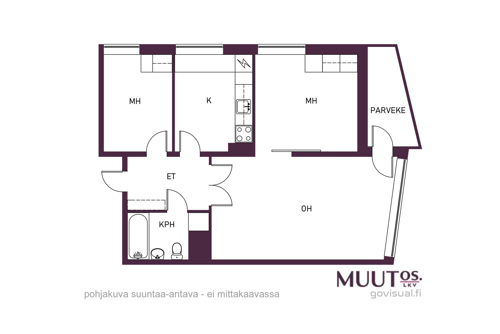 - Edellä mainittu pinta-ala saattaa tämän ikäisessä kohteessa poiketa olennaisestikin huoneiston nykyisen ja rakentamisaikaisen mittaustapojen ja standardien mukaan laskettavasta pinta-alasta. Huoneiston todellinen pinta-ala voi olla yhtiöjärjestyksessä, isännöitsijäntodistuksessa ja esitteessä mainittua pienempi tai suurempi. Hinta ei ole pinta-alaperusteinen. Yhtiöjärjestyksen mukainen huoneistoselitelmä: 3 h+k.