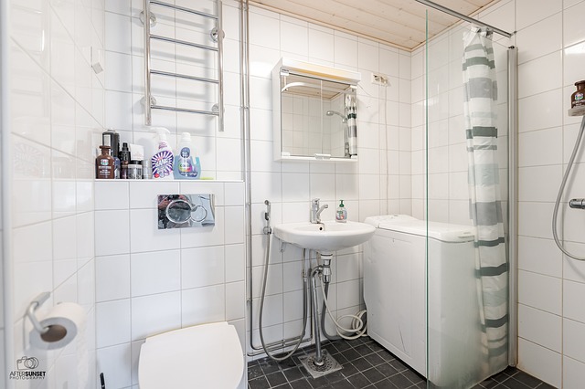 - WC-istuin, peilikaappi, suihkuseinä, suihku, pesukoneliitäntä, ja kiinteät valaisimet