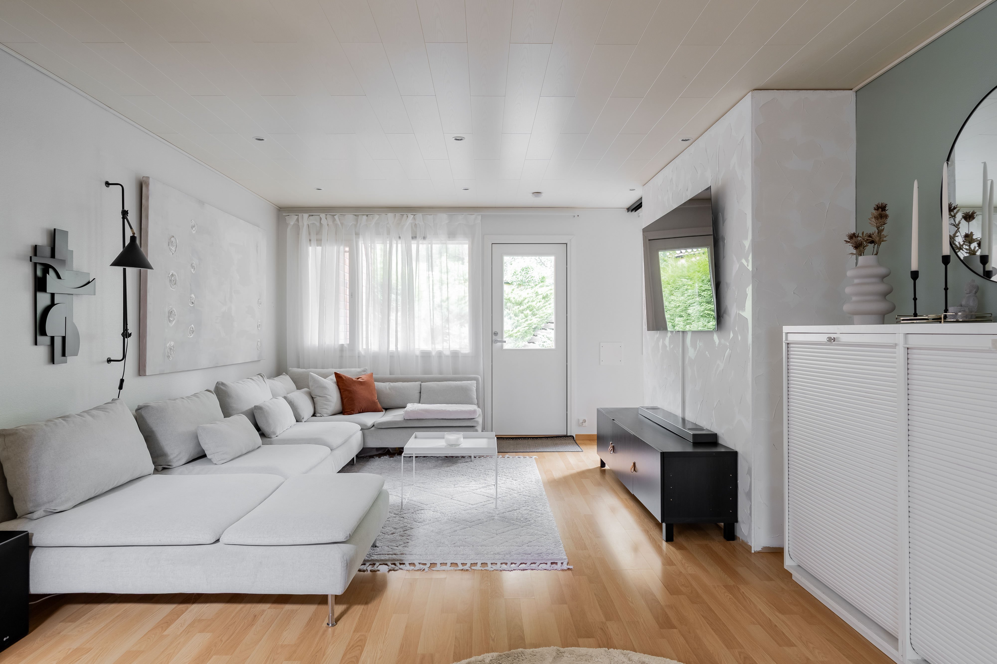 - Olohuonetilaa niin ala- kuin yläkerrassakin. Alakerran olohuoneessa on takkavaraus ja kulku kodin takapihan terassille. Yläkertaan saa hyvin toisen olohuoneen.