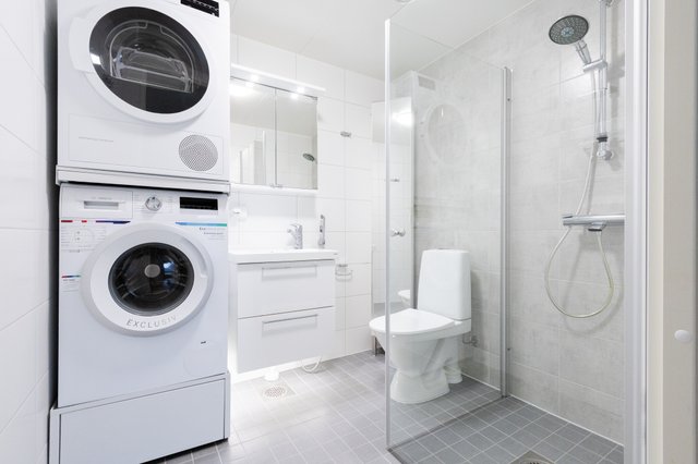 - Varusteet: allaskaappi, wc-istuin, suihku, suihkuseinä, pesukoneliitäntä, lattialämmitys. Lattiamateriaali: laatta. Seinämateriaali: kaakeli.