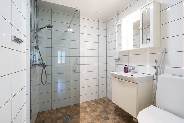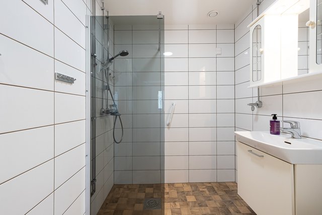 - WC-istuin, suihkuseinä, peili, suihku, bidee-suihku, pesuallas, allaskaappi, pesukoneliitäntä, ja lattialämmitys