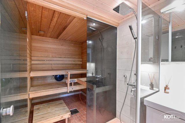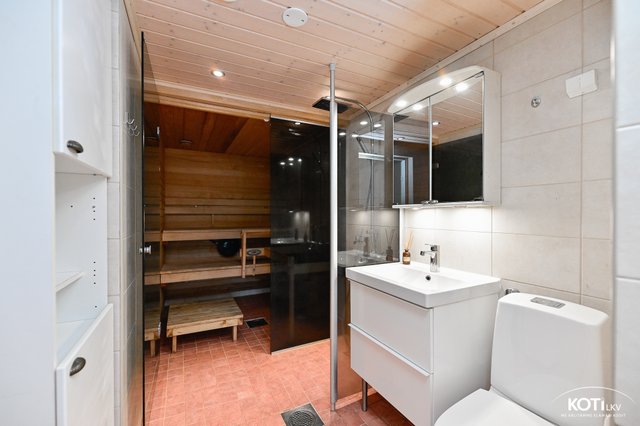 - Kylpyhuone uusittu 2005. Lasiseinä kylpyhuoneen ja saunan välissä. Varustus: sadesuihku, peilikaappi, allaskaappi, kaapistot, wc-istuin, suihkuseinä, pesukoneliitäntä, mukavuuslämmitys.