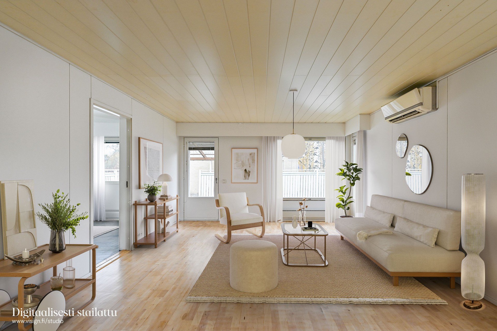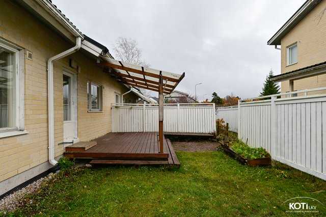- Todella avara olohuone (ikkunoita kahteen suuntaan). Olohuoneesta käynti valokatetulle terassille, jonka jatkeena etelä päätypiha. Olohuoneessa ilmalämpöpumppu.