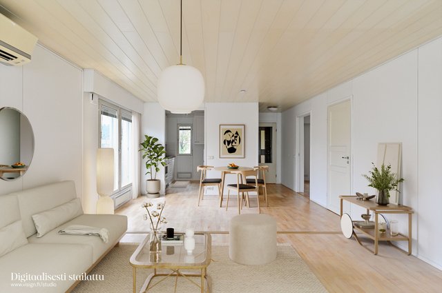 - Valoisa olohuone yhdistyy sujuvasti ruokailutilaan ja keittiöön, luoden avaran ja viihtyisän kokonaisuuden.