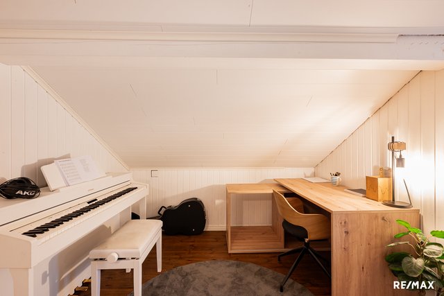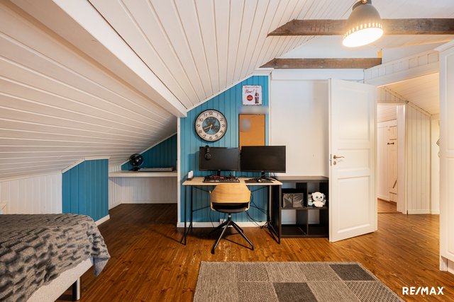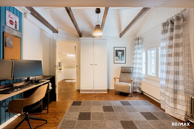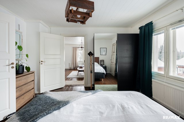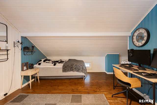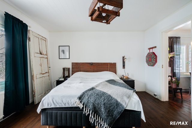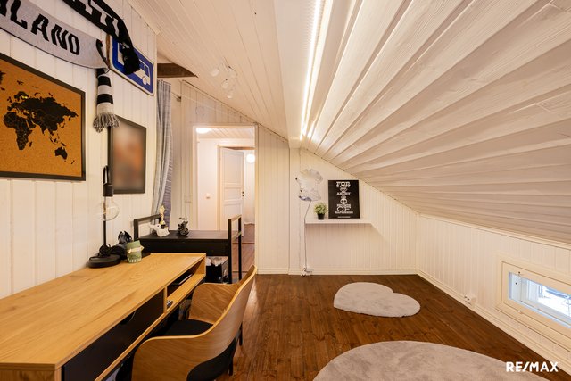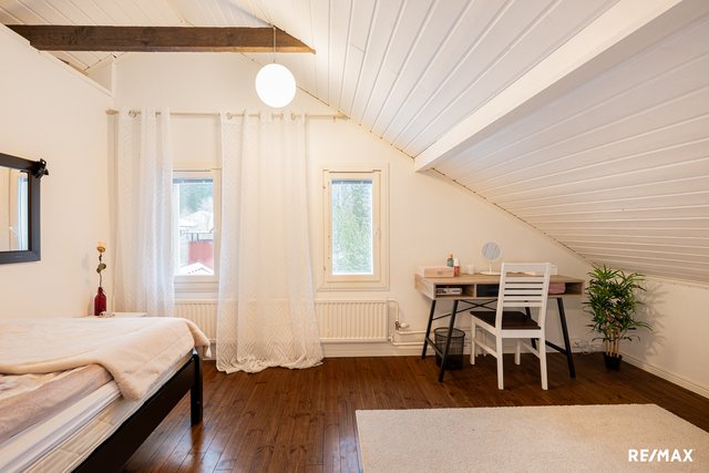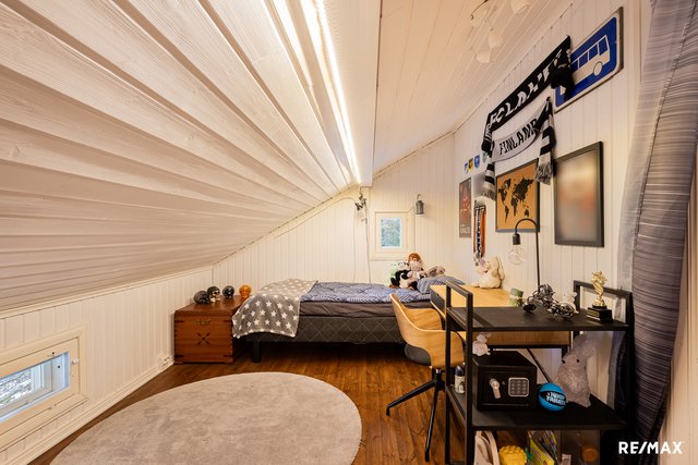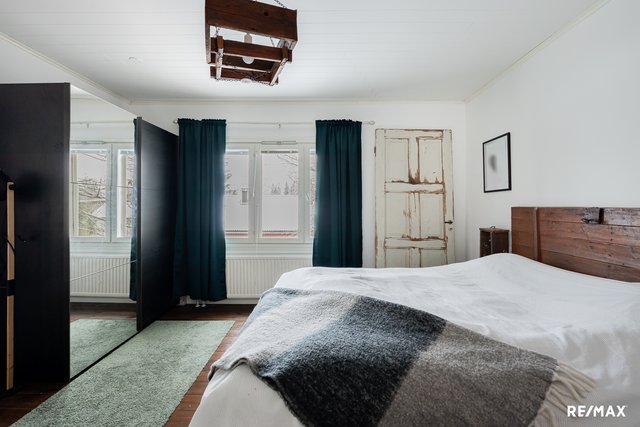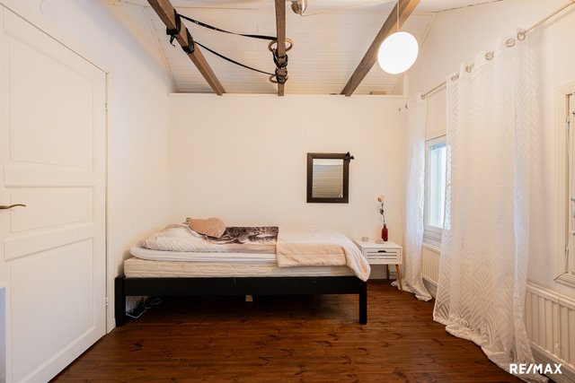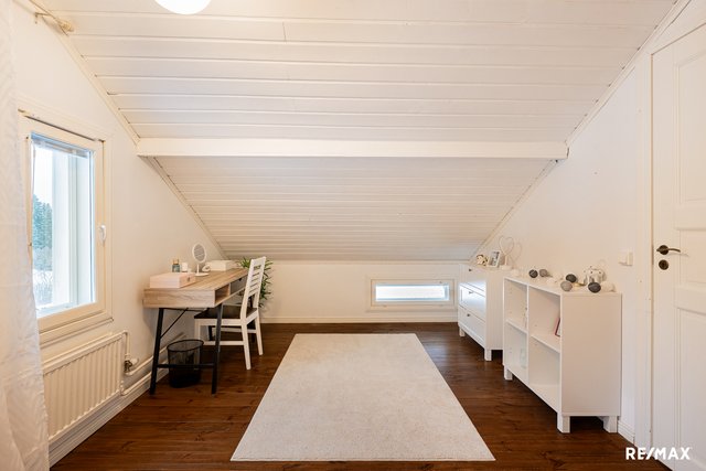 - Keskikerroksessa yksi makuuhuone ja yläkerrassa kolme makuutilaa. Makuuhuoneissa lankkulattiat.