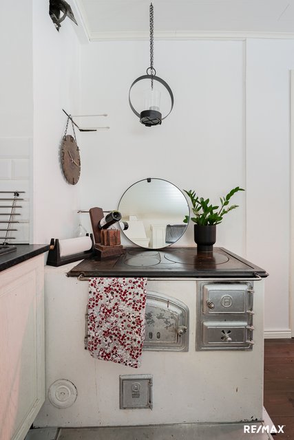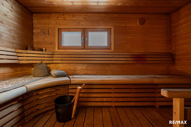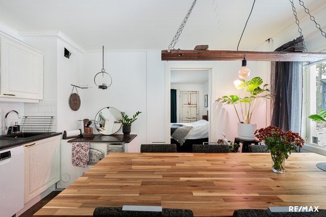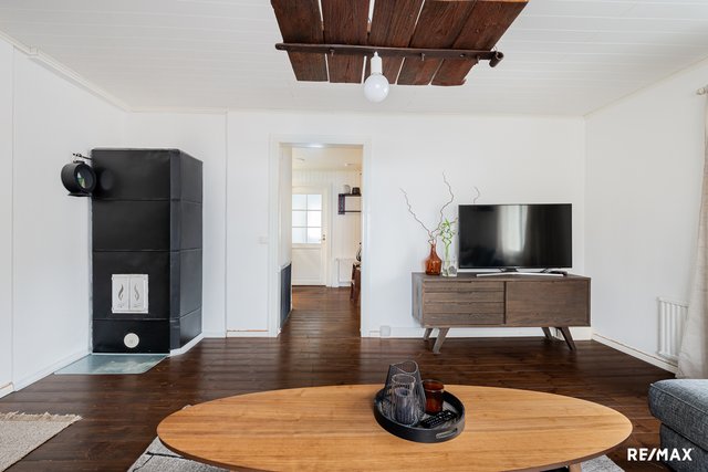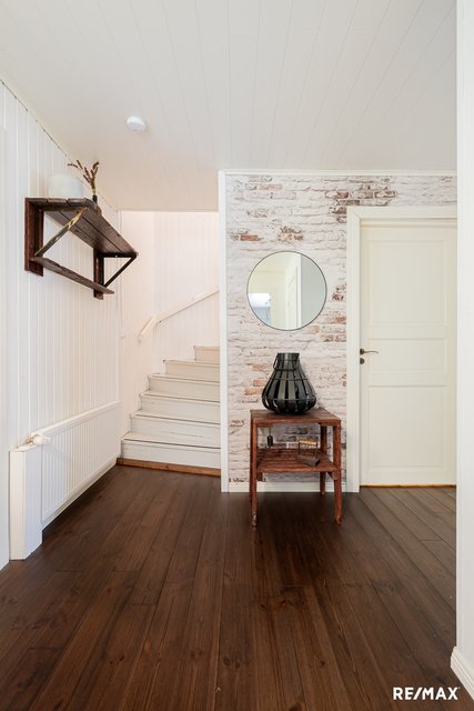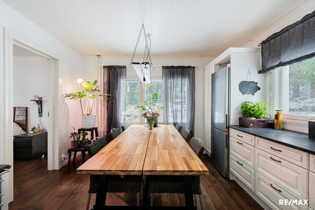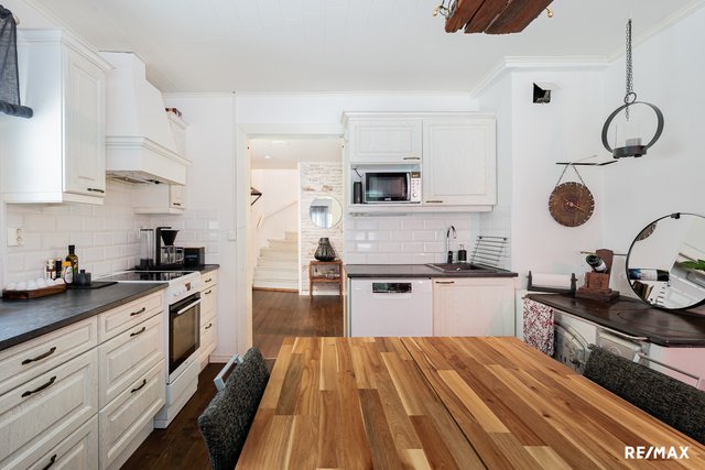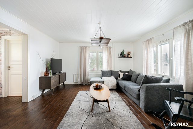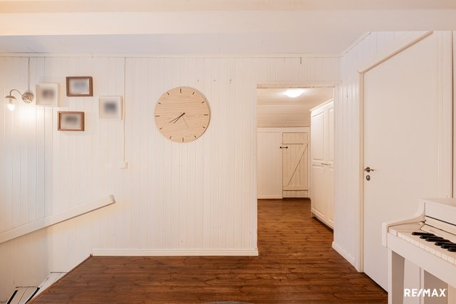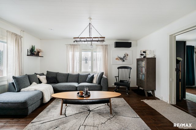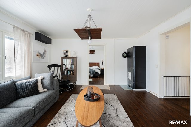 Tämä vuonna 1953 rakennettu ja vuosien varrella mittavasti kunnostettu koti tarjoaa toimivat tilat koko perheelle. Keskikerroksen keittiö on varusteltu arjen käytännöllisyyttä silmällä pitäen: keraaminen liesi, astianpesukone, leivinuuni sekä hyvät kaappi- ja työtilat. Olohuone jatkuu kodikkaasti lankkulattioihin, ja kokonaisuutta täydentävät kylpyhuone, puulämmitteinen sauna sekä suoraan ulos avautuva kodinhoitohuone.