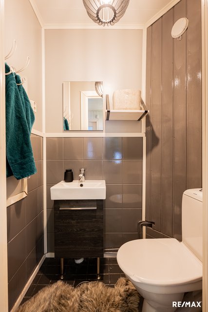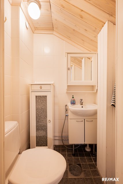 - Laatoitettu kylpyhuone, jossa lattialämmitys. Varusteena myös käsienpesuallas.