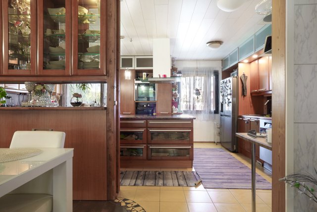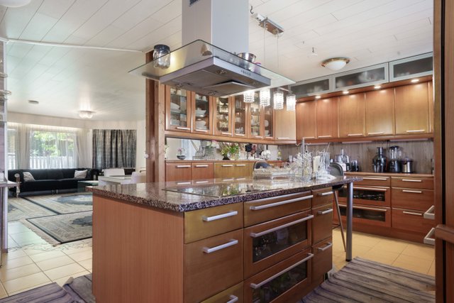 - Jääkaappi, erillinen pakastin, erillisuuni, liesi, liesituuletin, astianpesukone, ja keittiösaareke