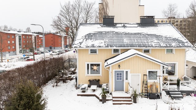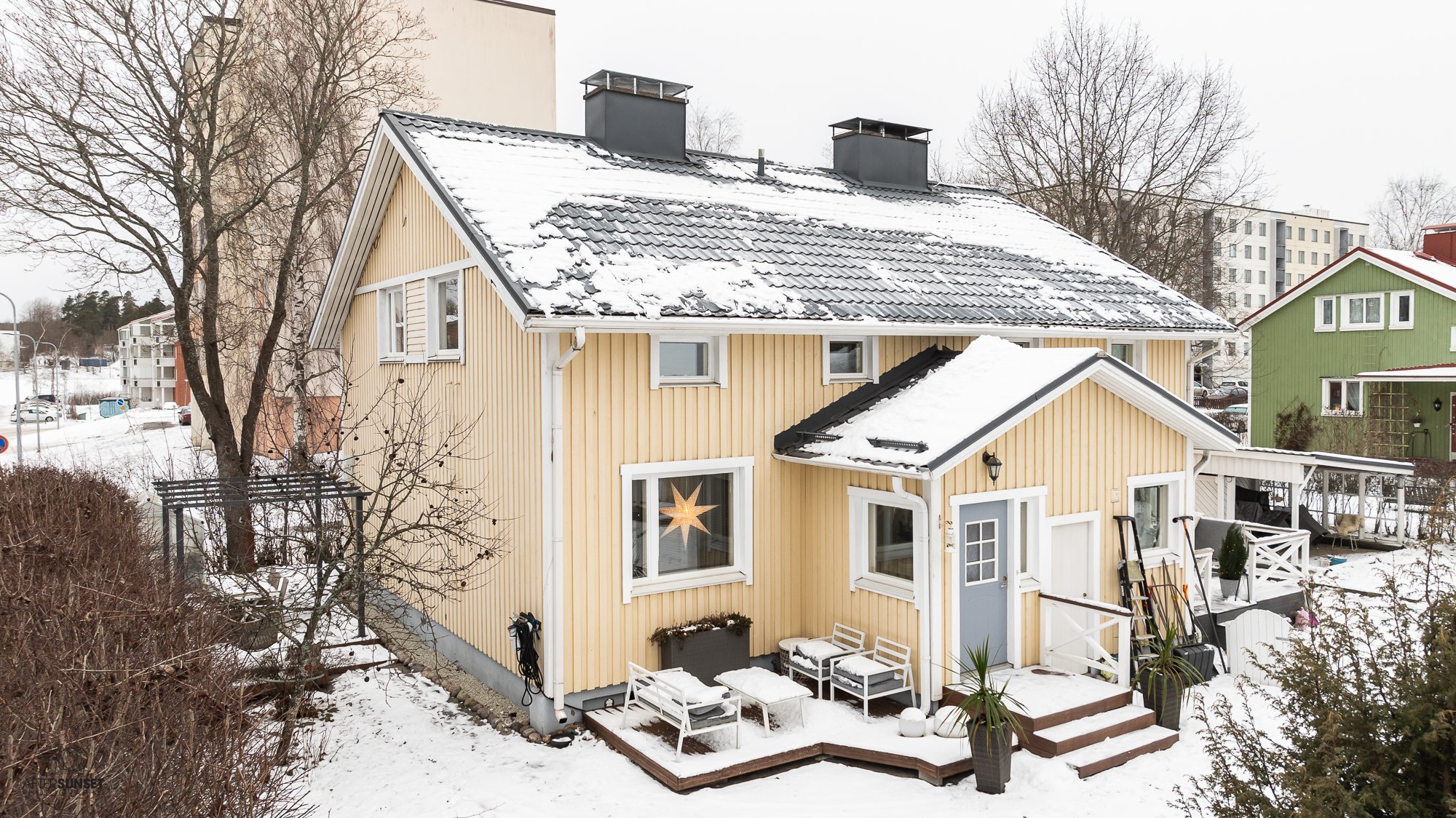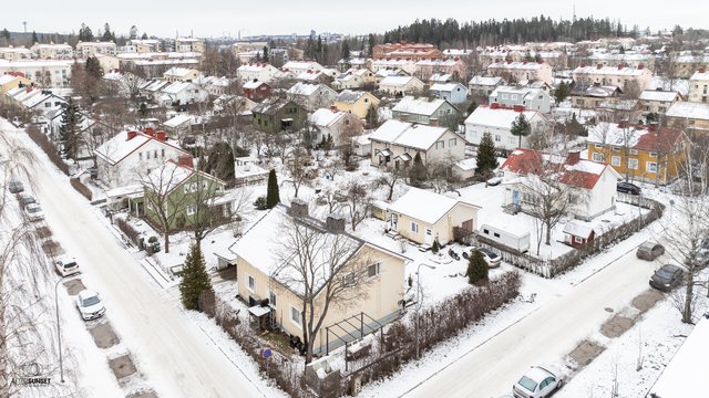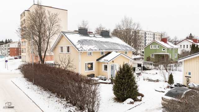 Huoneistoa on käyty kattavalla kädellä läpi remonttien osalta, mutta vanhan talon henki on saatu hienosti säilytettyä. Sisään astuessa kiinnittyy katse heti alkuun vastaan tulevaan, nykyaikaiseen, tummaan keittiöön, johon on jätetty hirsiseinää näkyviin tuomaan todella näyttävän ja tunnelmaa luovan vaikutelman. Lattiat ovat pitkälti huoneistossa vanhaa puulattiaa ja ne on käyty läpi muutamia vuosia sitten ja ovatkin siistissä kunnossa, kuten asunnon muutkin pinnat. Ensimmäisessä kerroksessa sijaitsee lisäksi olohuone, makuuhuone ja kylpyhuone. Yläkerrasta löytyy monikäyttöinen aulatila, johon saa kivasti aseteltua esimerkiksi työpisteen. Yläkerrassa on makuuhuone ja kylpyhuone lisänä. Vanhoihin taloihin tyyppillisesti, myös kellari on olemassa. Kellarissa on runsaasti varastointitilaa, kodinhoitohuone sekä naapurin kanssa yhteinen sauna pesutiloineen.