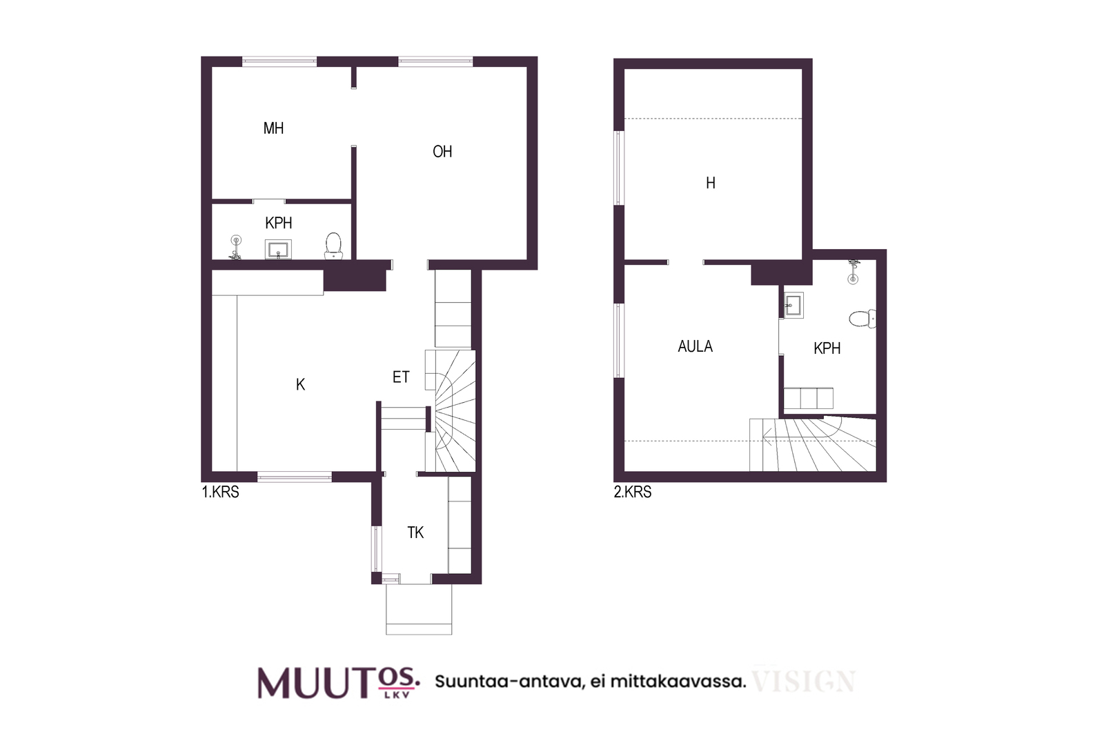 - Pinta-alat perustuvat yhtiöjärjestyksen ja isännöitsijäntodistuksen mukaisiin tietoihin. Ilmoitettuun asuintilojen pinta-alaan on yhtiöjärjestyksen mukaa laskettu 1. kerroksen kaksi huonetta ja keittiö, 2. kerroksen kaksi huonetta ja kellarikerroksen askarteluhuone. Yhtiön välittömään hallintaan jää kellarikerroksessa olevat sauna- ja lämmönjakotilat. Rakennuslupapiirustuksista lasketun arvion mukaan asuintilojen pinta-alan on noin 85 m² ja muiden tilojen pinta-ala noin 6 m², johon on laskettu mukaan askarteluhuone. Edellä mainittu pinta-ala saattaa tämän ikäisessä kohteessa poiketa olennaisestikin huoneiston nykyisen ja rakentamisaikaisen mittaustapojen ja standardien mukaan laskettavasta pinta-alasta. Huoneiston todellinen pinta-ala voi olla yhtiöjärjestyksessä, isännöitsijäntodistuksessa ja esitteessä mainittua pienempi tai suurempi. Hinta ei ole pinta-alaperusteinen. Yhtiöjärjestyksen mukainen huoneistoselitelmä: I kerros: kaksi huonetta ja keittiö II kerros: kaksi huonetta Kellarikerros: askarteluhuone