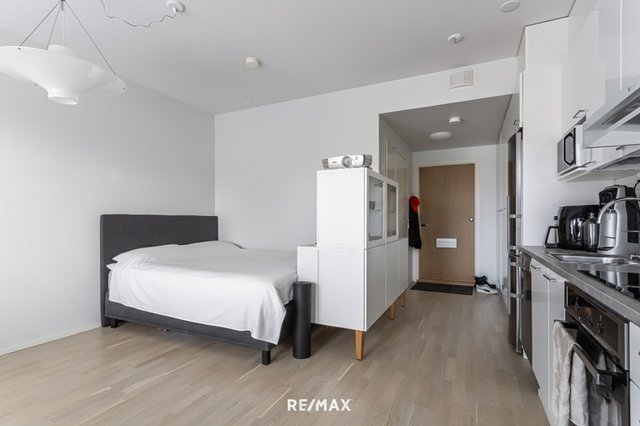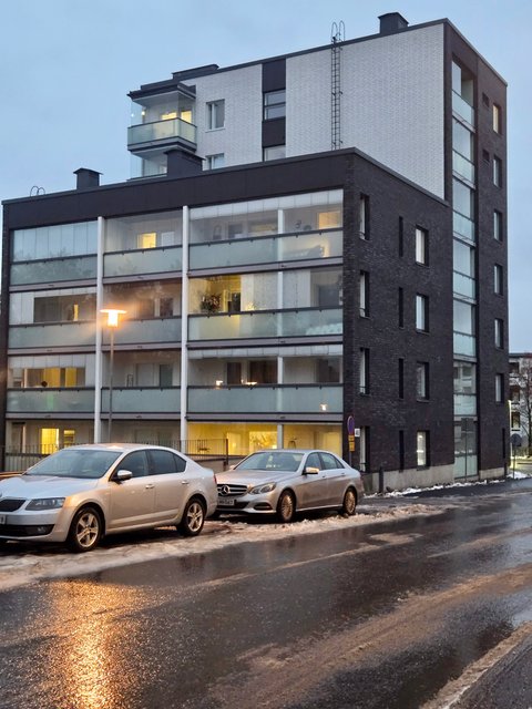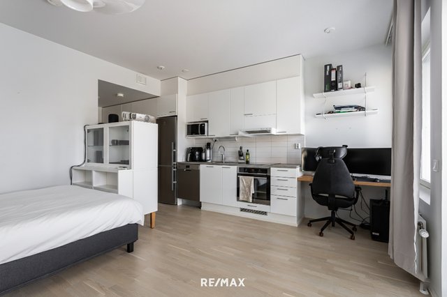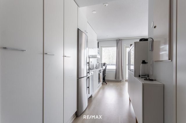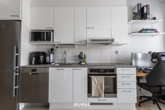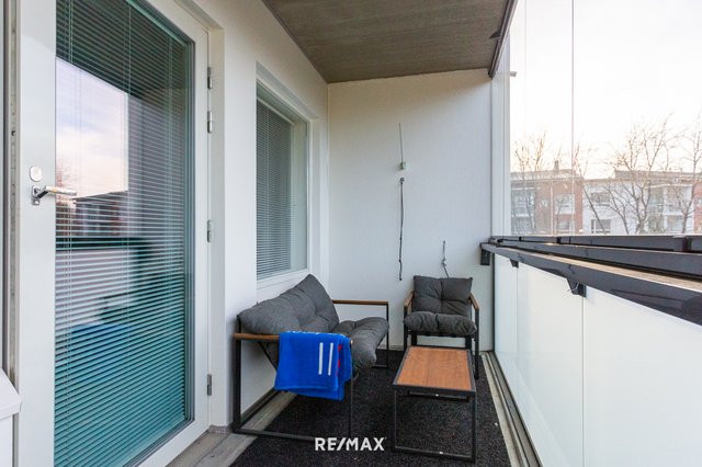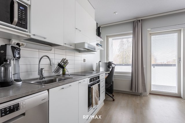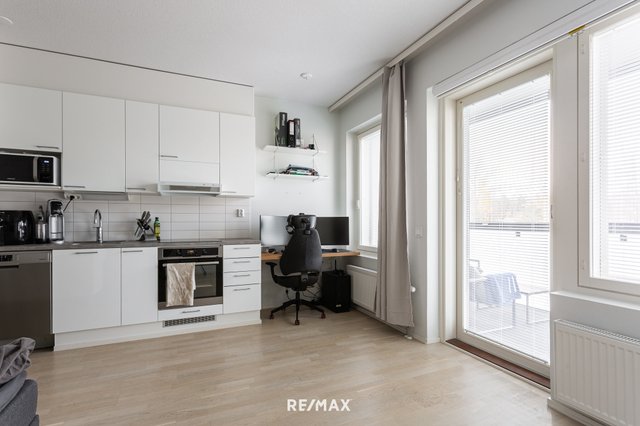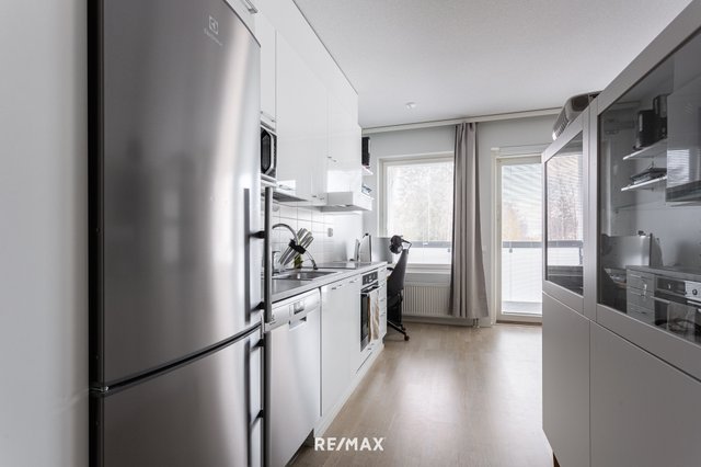 Asunto sijaitsee kolmannessa kerroksessa, ja sieltä on käynti lasitetulle parvekkeelle, joka tuo mukavasti lisätilaa ja valoa. Yhtenäinen olohuone ja keittiö luovat avaran tunnelman, ja keittiö on varustettu nykyaikaisilla laitteilla, kuten induktioliedellä ja astianpesukoneella. Kylpyhuone on tyylikkäästi laatoitettu ja tarjoaa kaikki tarvittavat mukavuudet.