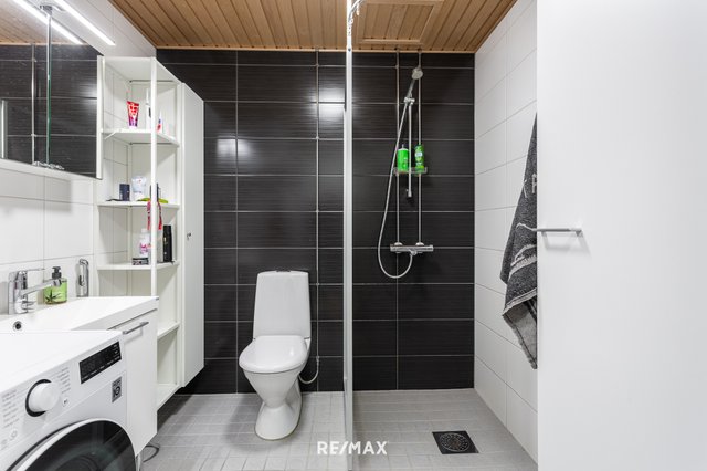 - WC-istuin, suihku, pesukoneliitäntä, pesuallas, bidee-suihku, peilikaappi, allaskaappi, ja suihkuseinä