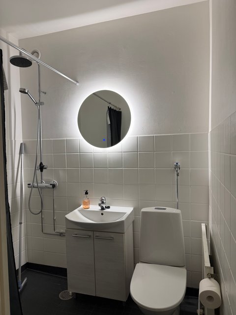 - WC-istuin, suihku, pesuallas, allaskaappi, ja peili