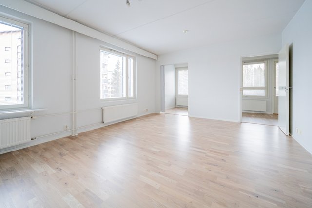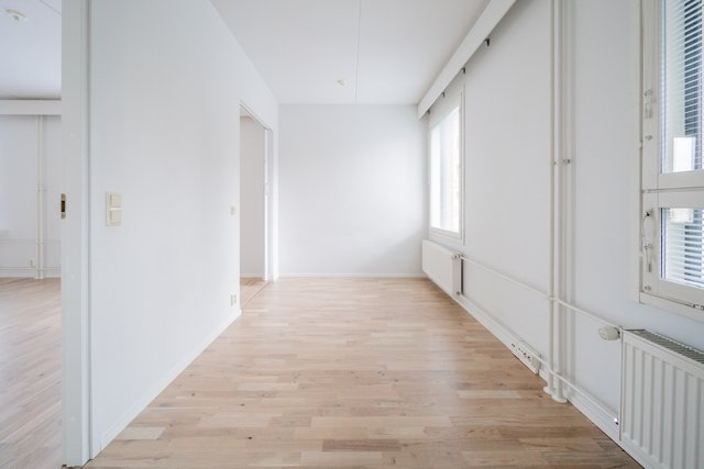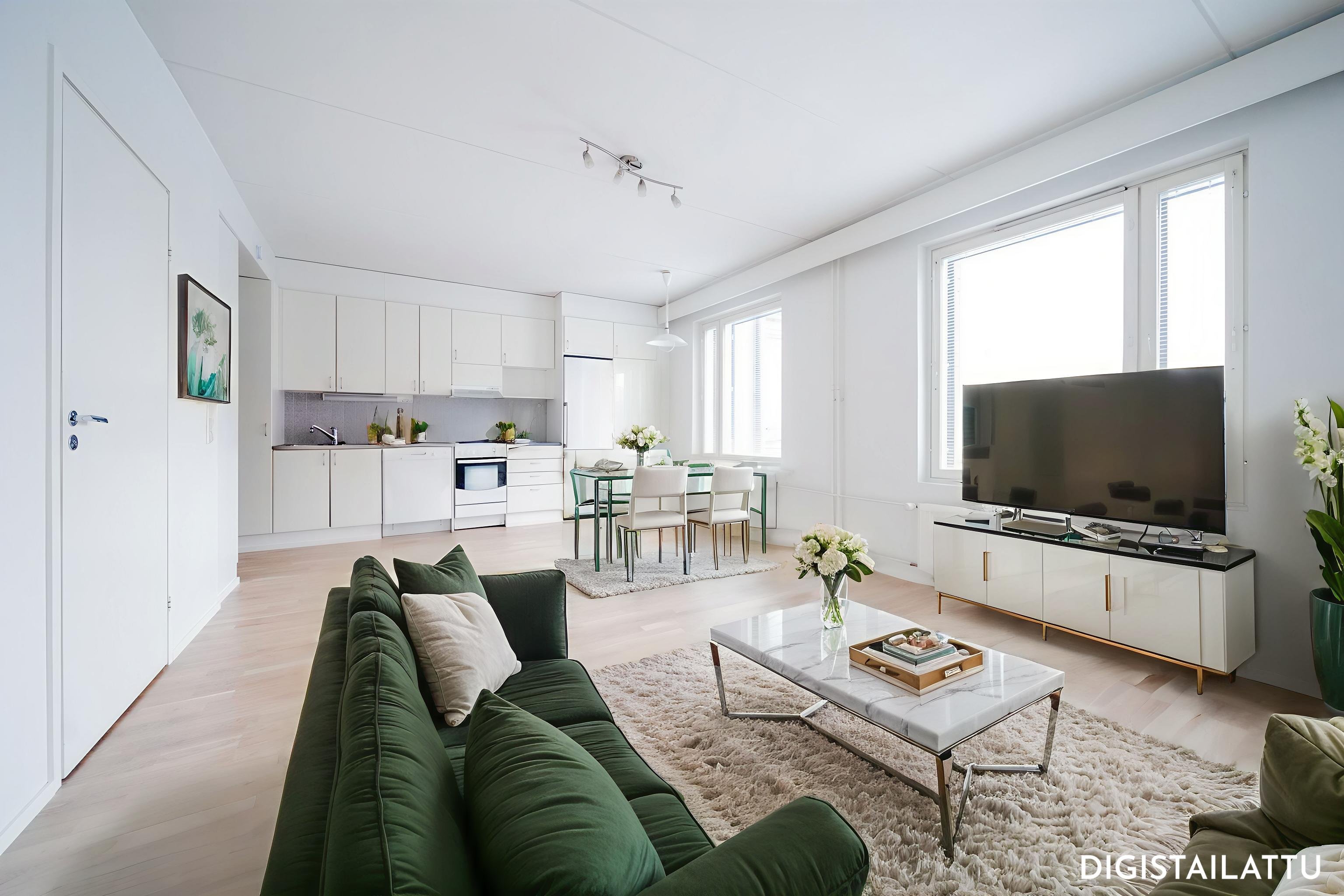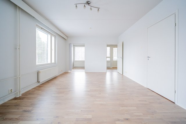 - Tilava ja valoisa olohuone, joka on yhtenäistä tilaa keittiön kanssa. Tilasta kaksi ovea makuuhuoneeseen.