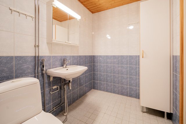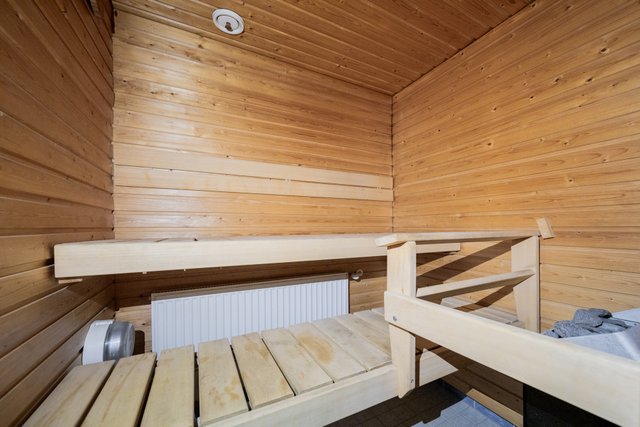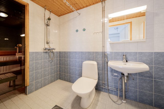 Kylpyhuone on hyväkuntoinen ja sieltä löytyy paikka pyykinpesutornille. Oman saunan löylyissä rentoudut pitkän päivän päätteeksi.