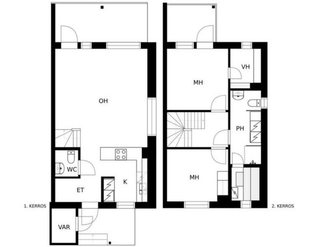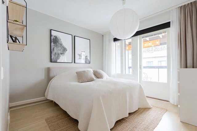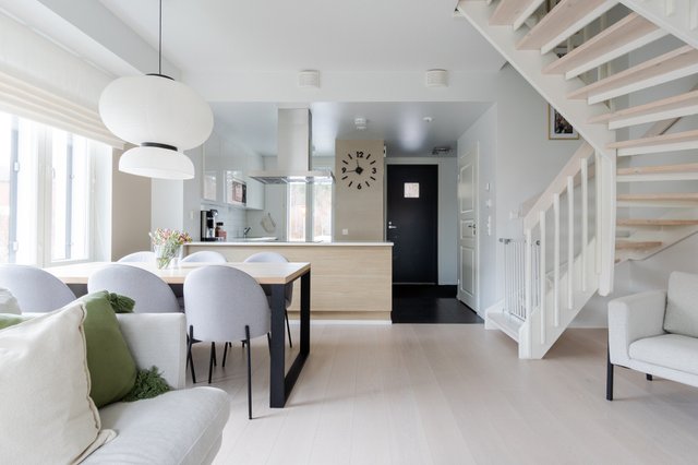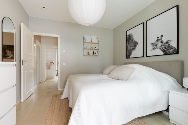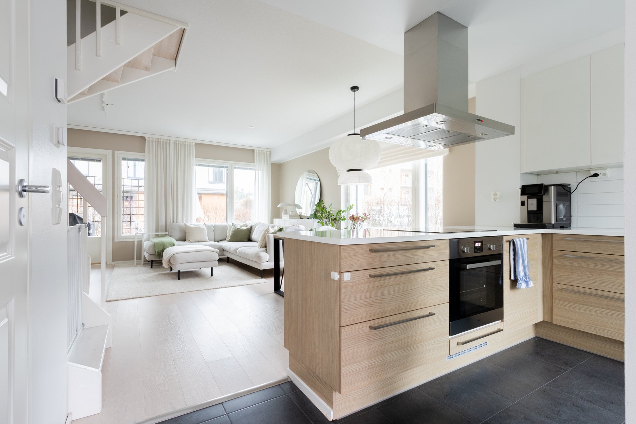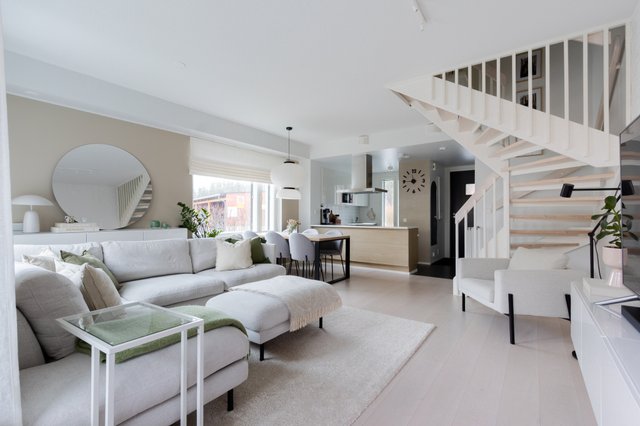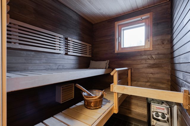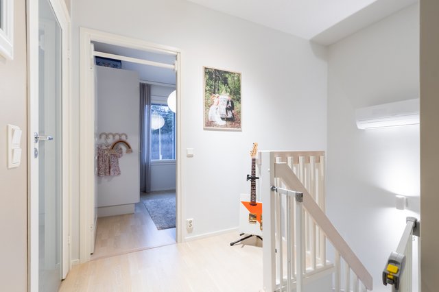 Alakerrassa sijaitseva keittiö on varustettu monipuolisesti ja tarjoaa tilaa ruoanlaittoon, kun taas olohuone kutsuu rentoutumaan. Yläkerrassa on kaksi makuuhuonetta, jotka tarjoavat rauhallisen paikan levätä. Asunnossa on myös sauna, jossa voi rentoutua päivän päätteeksi.