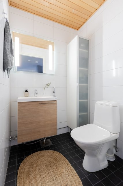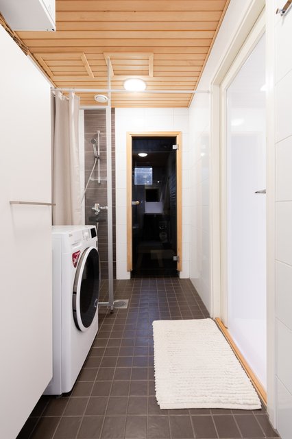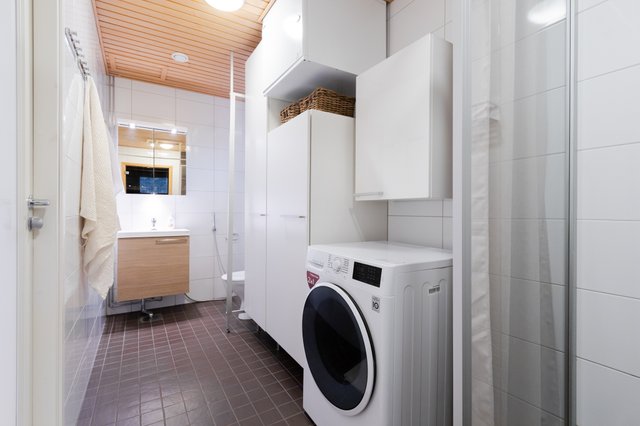 - WC-istuin, suihku, suihkuseinä, pesukoneliitäntä, lattialämmitys, peilikaappi, allaskaappi, ja bidee-suihku