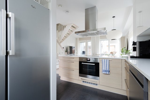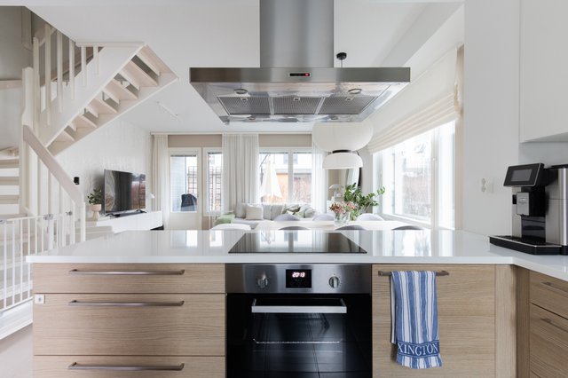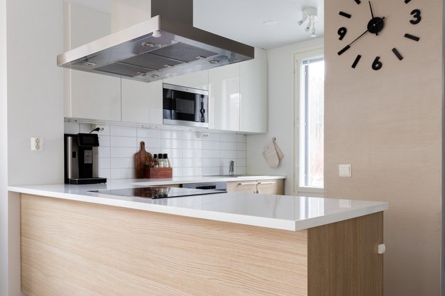 - Jääkaappi, erillinen pakastin, liesi, liesituuletin, mikroaaltouuni, astianpesukone, ja keittiösaareke