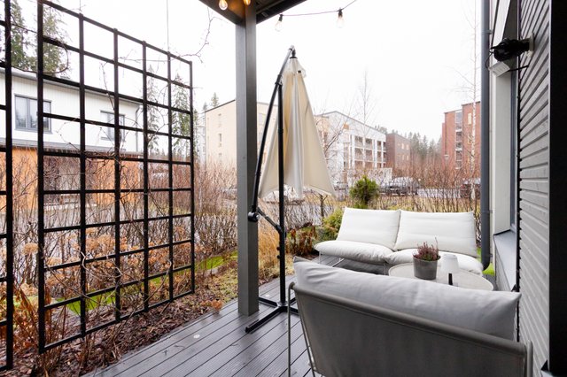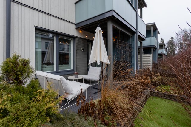 Kodin ulkotilat, kuten parveke ja terassi, tuovat lisäarvoa ja mahdollistavat ulkoilmasta nauttimisen. Lisäksi ulkovarastot ja vaatehuone tarjoavat runsaasti säilytystilaa.