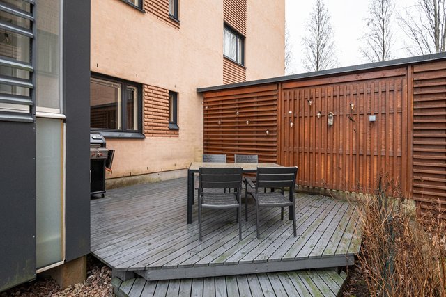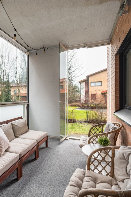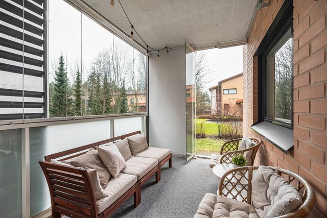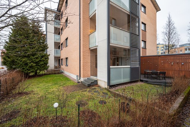 Sauna, lasitettu terassi, isohko piha, tehokas pohjaratkaisu ja ilmalämpöpumppu viilennykseen. Ei kai voi muuta enää toivoa? Lisäksi asunto vapautuu joustavasti kaupan jälkeen.