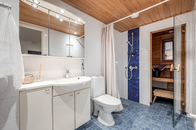 - WC-istuin, suihku, pesukoneliitäntä, lattialämmitys, peilikaappi, pesuallas, ja bidee-suihku