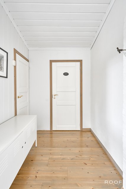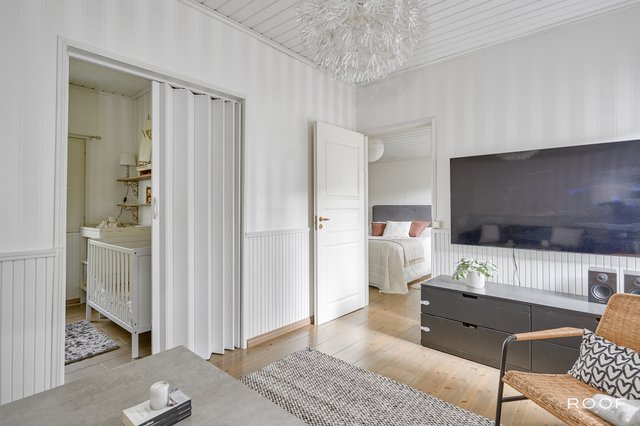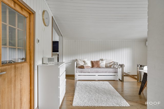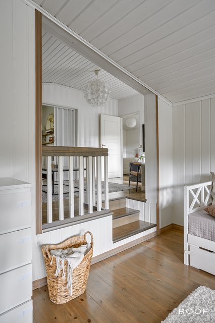 Yläkerran tilat jakautuvat kahteen tasoon: ylätasolla sijaitsevat kaksi makuuhuonetta ja aulatila, alatasolla avautuu valoisa olohuone ja tyylikäs keittiö, jossa kodikkuutta ja lämpöä luo takka leivinuunilla. Olohuoneesta ja yläkerran terassilta avautuu lumoava näkymä joelle - maisema, joka kutsuu pysähtymään ja nauttimaan luonnon kauneudesta.