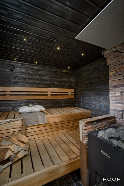Vuonna 2022 uusitut kodinhoito-, sauna- ja pesutilat sijaitsevat alakerrassa, josta on myös käynti terassille. Molemmista kerroksista pääsee ulos, ja vain muutama askel puusaunan pehmeistä löylyistä vie virkistävään uintiin omassa rannassa. Laiturin yhteydessä odottaa palju - täydellinen paikka rentoutua luonnon helmassa.