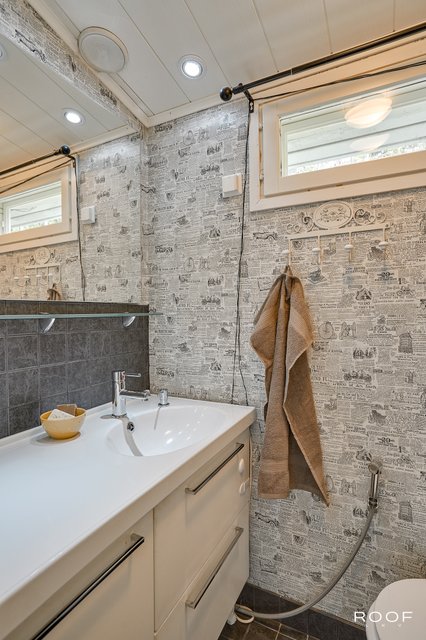 - WC-istuin, lattialämmitys (sähkö), allaskaappi, ja peili