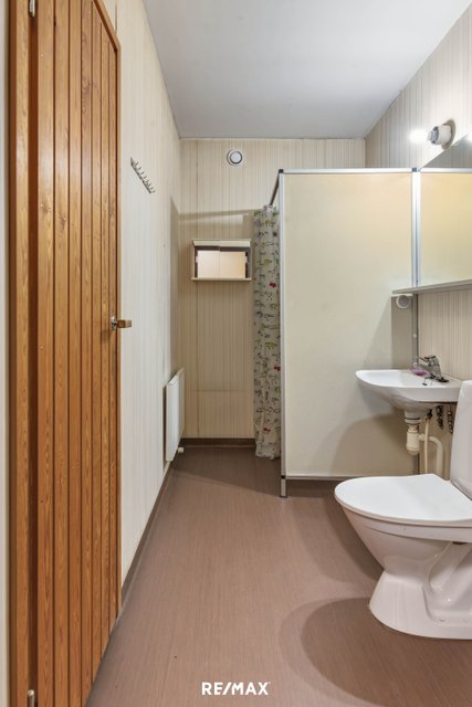 - WC-istuin, suihku, pesukoneliitäntä, pesuallas, suihkuseinä, ja peili