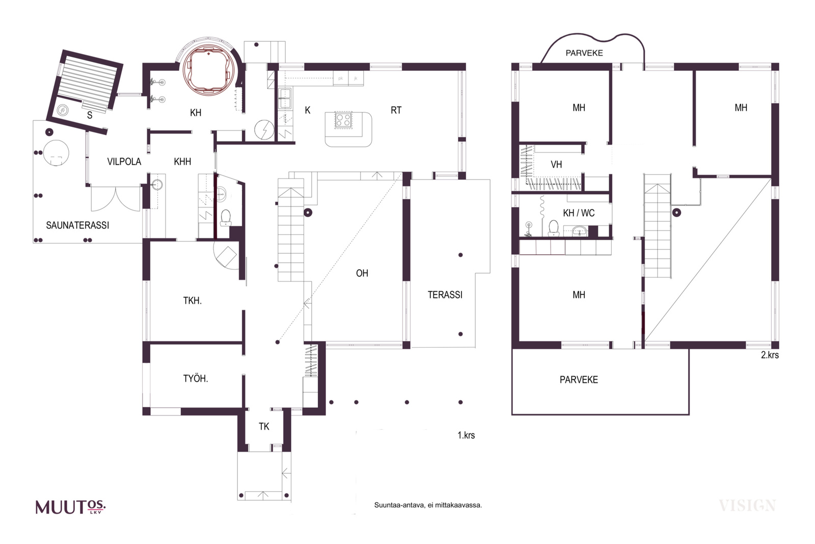 6h, avokeittiö, aula, 2 x wc, 2 x kph, vh, s, 2 x parveke, vilpola, 2:n auton katos, 2 x varasto