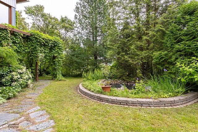 - Puutarhamainen tasamaatontti, jossa paljon istutuksia ja suihkulähde.